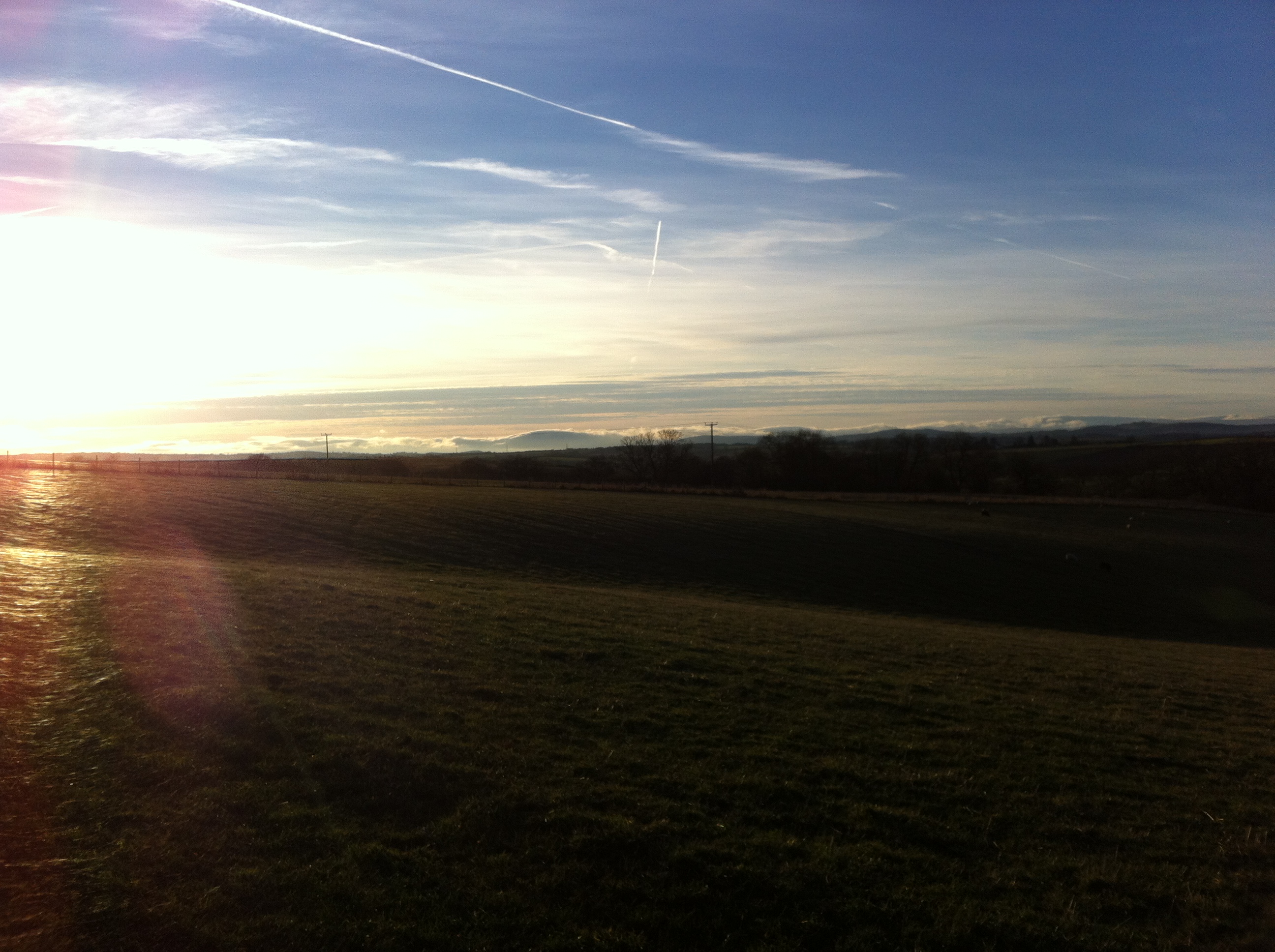 Jessie and I walk on, talking about Buddhism, vows, our reluctant flexitarian meat-eating and its contradictions. We sprint, squealing, along the edge of a potato field, only just timing it right that we avoid a drenching by the rotating irrigator. Then we drop down and past the massive, industrial-scale Cobrey Farm: acres of fruit and pickers’ static caravans. We pass what I assume (from their accents and dress and our exchange of smiling, gesticulating nods) two European farm workers, also walking into Ross and playing music on their phone speakers as they do. It prompts us (Jessie and me) to discuss how more and more often (as Rebecca Solnit writes) we (culturally not personally!) think of walking as waste of time, a dead space to be filled with music on iPods or mobile phone conversations, neglecting the sensual pleasure that walking has to offer, not least as a mode of engagement with environment and self. We also talk about mobile phones, EMFs and the subtle body: are we living in a massive, global experiment that is scrambling our selves and our eco-systems, our bees and our pollinators and so ultimately our agriculture?