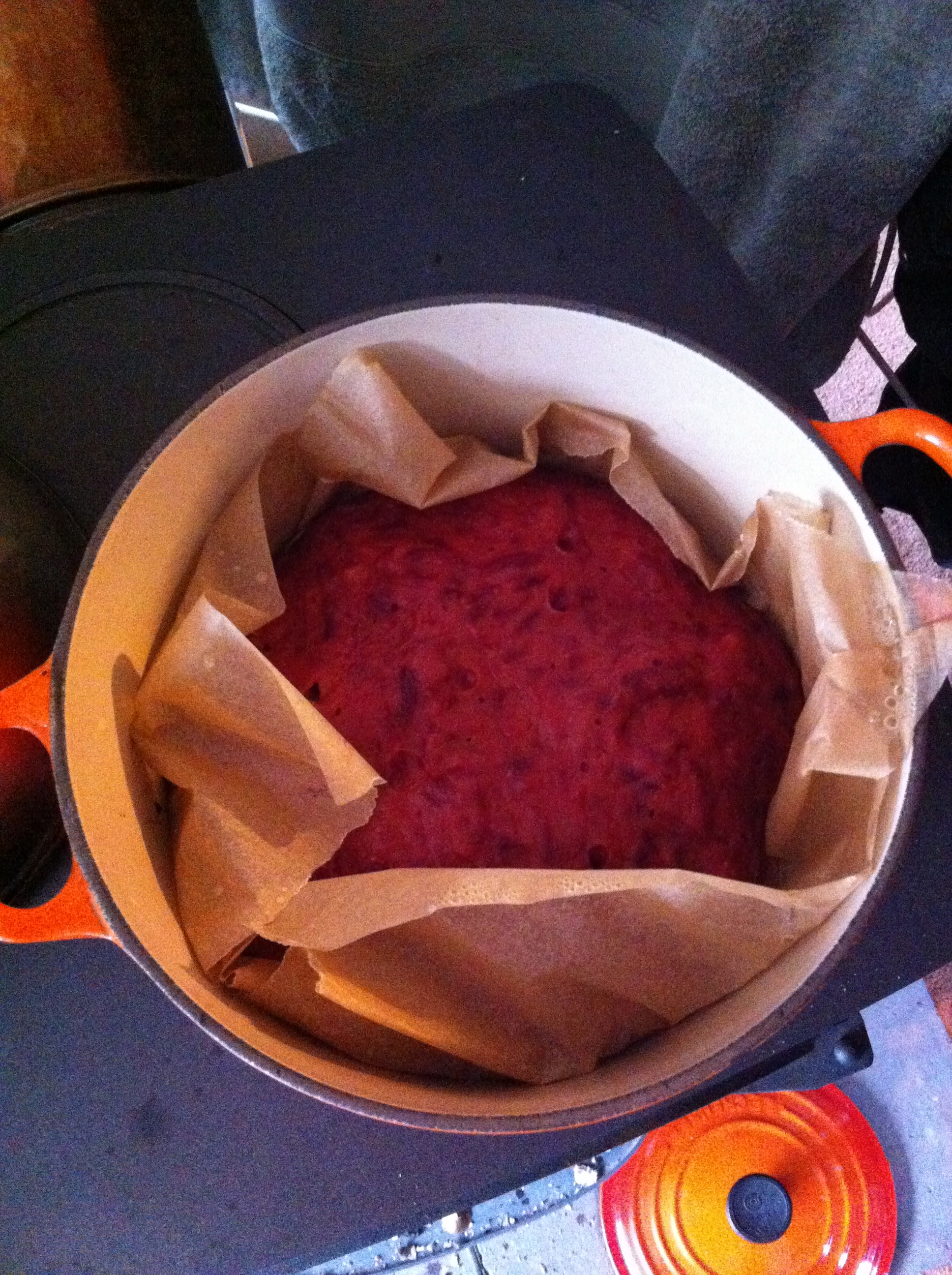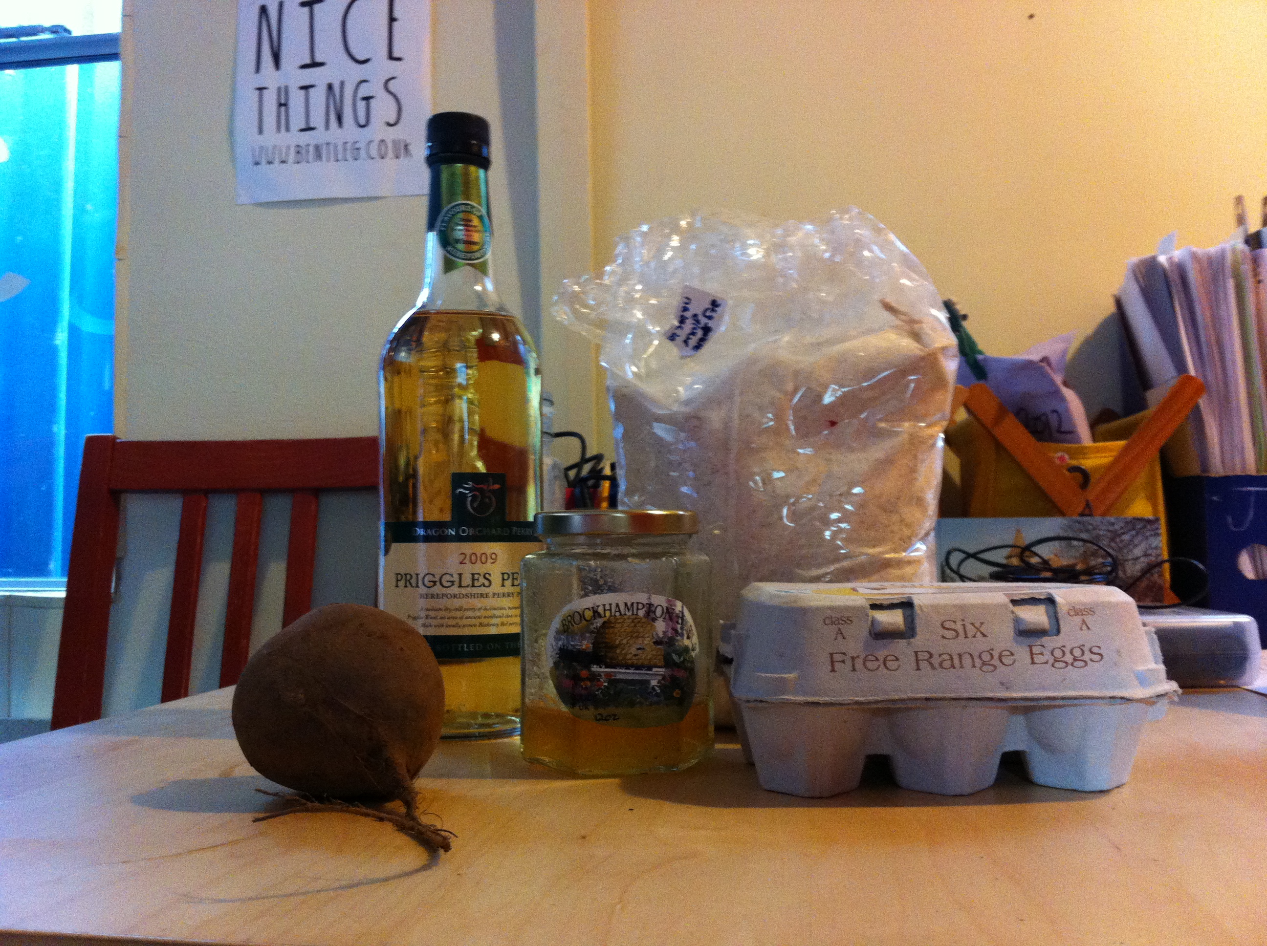 I settle on a menu of root stew with rye/spelt flatbreads followed by an improvised attempt at fatless beetroot cake (fatless because I’m allergic to dairy and while oilseed rape is grown on the farm, it is pressed and processed elsewhere; beetroot because it’s sweet and pretty).