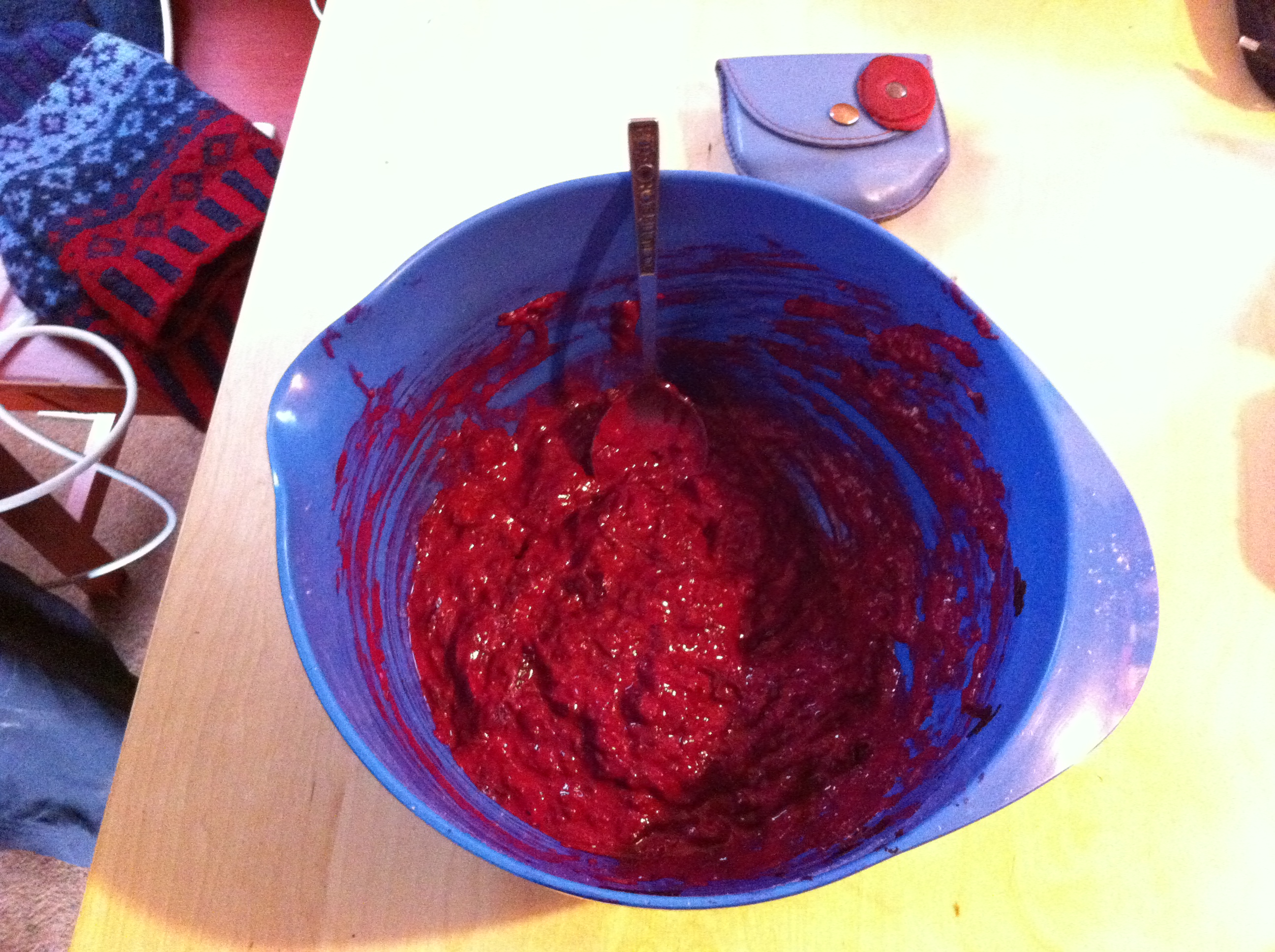 Some of you (if anyone’s reading this) may remember the infamous mumpets, the improvised fat-less, sugar-less stove-top beetroot cake of the last performance. I have since made and taken a batch of mumpets to every talk I’ve done about All in a Day’s Walk around the county and country: Putley, Manchester, Ledbury, Staunton-on-Arrow. While the usual comment is that they match the colour of my hair, the response to mumpets has been mixed…