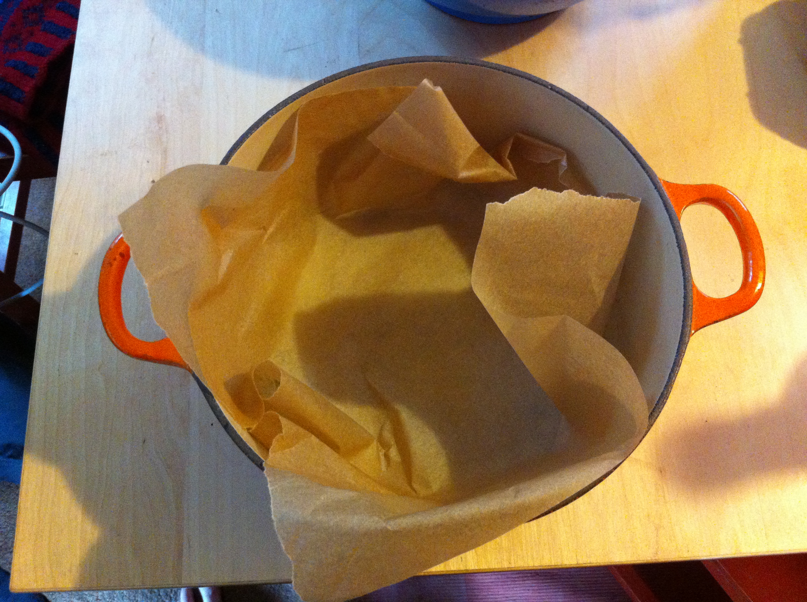 Cast iron lidded cooking pot or Dutch oven, lined with baking parchment