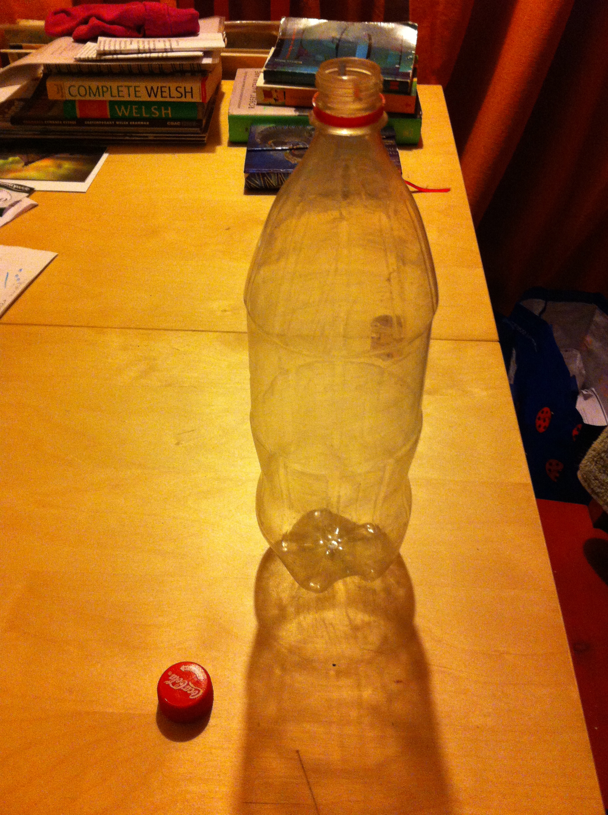 I found these instructions on the RSPB website a few days ago but saw that they required a plastic bottle. As I’ve got none in the house and I won’t be buying anything that’s not local (and, interestingly, all the local food packaging I’ve come across has been glass, paper or card), I thought I’d have to raid the farm recycling. But on yesterday’s walk to the Crown, I found a discarded Coke bottle on the Woolhope road = perfect eco-smugness factor: de-littering the countryside and feeding the birds at the same time.