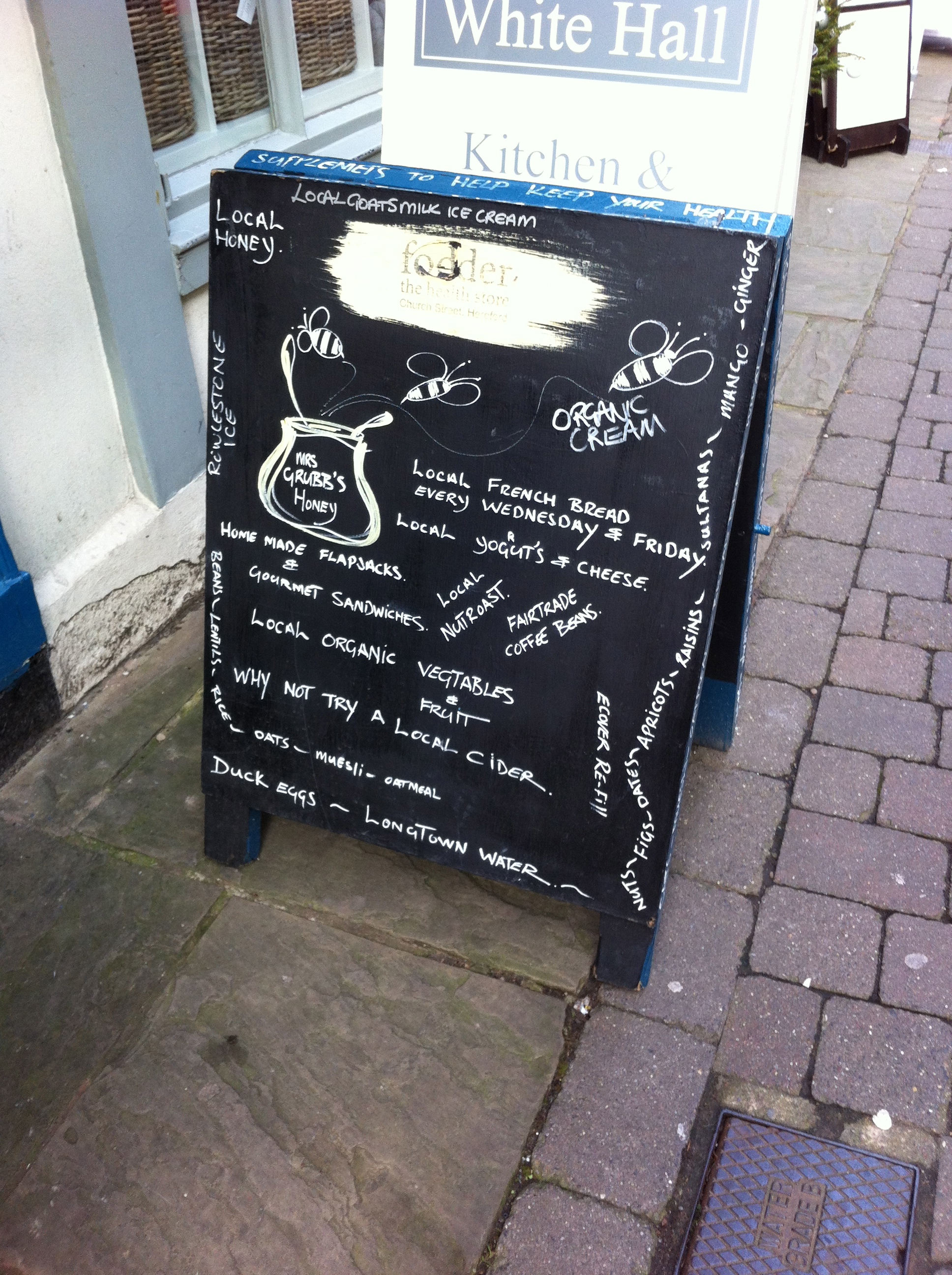 Today, thanks to the generosity of friend Hugh, I’m mildly hungover (largely sleep deprivation from late conversation) on his family’s local and delicious Once Upon a Tree cider and perry from Dragon Orchard at Putley. But I still have to walk 9 miles home in -1 cold. I pop into Hereford city centre first, but even at the wholefood shop, I’m surprised that, today at least, I can’t find produce that can be guaranteed within walking distance of home (which is not to say there is not a lot of produce from elsewhere in Herefordshire of course).